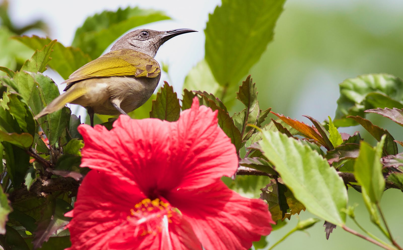 And a grey-eared honeyeater feeding on a hibiscus flower: